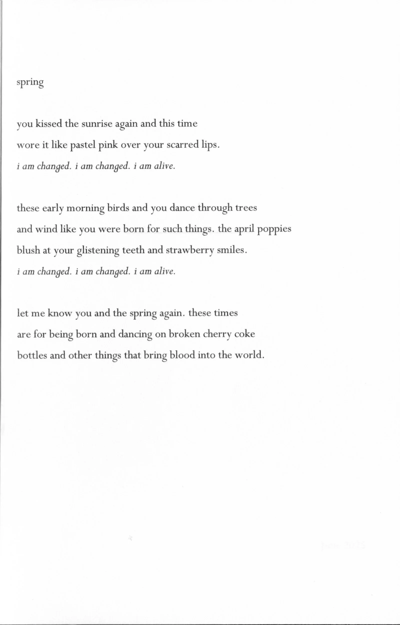The poems in About Love are about tenderness and confession. The collection delineates moments love and descriptions of love using imagery of the natural world, space, and the sublime.